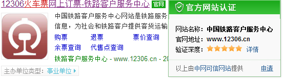 网民输入"机票"、"火车票"等关键词查找信息,可在搜索结果中便 捷核验网站真实身份。